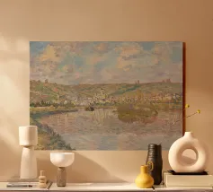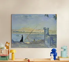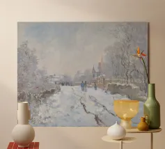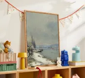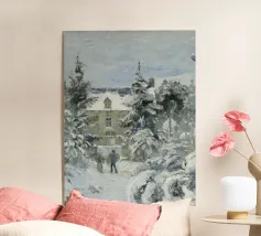 Questo tranquillo paesaggio invernale sulla riva del fiume mostra una passeggiata innevata con escursionisti, dolci colline e una distesa tranquilla sotto un luminoso cielo invernale. Le sottili sfumature di blu, grigio e bianco creano un'atmosfera invernale minimalista, piena di leggerezza e tranquillità. La scena combina un paesaggio fluviale in inverno, un'illustrazione naturalistica romantica, un'estetica invernale scandinava, un'arte paesaggistica senza tempo, una passeggiata in riva al mare sotto la neve e motivi naturalistici tranquilli. Ideale come murale invernale, arte da parete moderna, arredamento accogliente per la casa, decorazione naturale per il soggiorno, arte per gli amanti della natura.