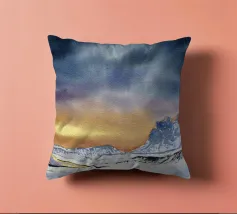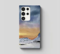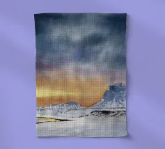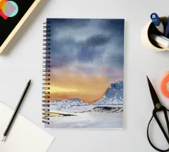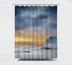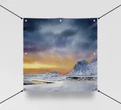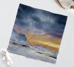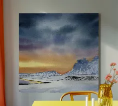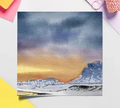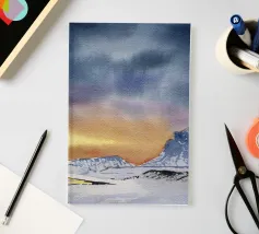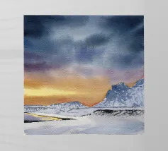 Paesaggio invernale ad acquerello di montagne nella luce serale con cielo e tramonto drammatici