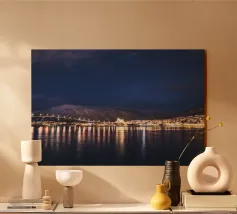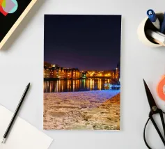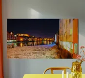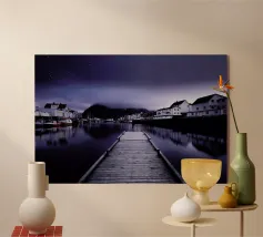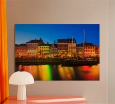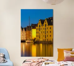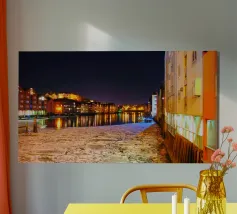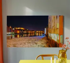 In una limpida e fredda notte d'inverno, la città offre un caldo bagliore dorato. Questa magica fotografia immortala lo storico lungofiume di Trondheim, in Norvegia, dove i magazzini colorati risplendono luminosi sul fiume Nidelva, ricoperto di ghiaccio. La luce calda si riflette nell'acqua scura tra i banchi di ghiaccio galleggianti, creando una scena di profonda pace e di accogliente "hygge". Un bellissimo tributo alla tranquilla magia dell'inverno nordico, questo pezzo conferisce un senso di calore, di quiete e di fascino atmosferico a qualsiasi spazio.