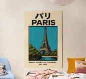 Bonjour, Parigi! Questo poster mostra la Torre Eiffel nell'iconico stile turistico retrò degli anni '20, con tipografia giapponese, linee chiare e colori intensi. Un classico per tutti gli amanti di Parigi, gli appassionati di design e gli amanti degli interni. Perfetto per le pareti di gallerie, salotti o decorazioni di caffè moderni. Parte della serie internazionale "World Icons - Retro Travel Series".