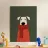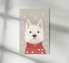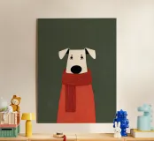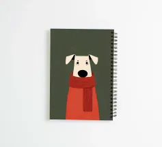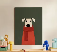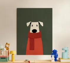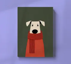 Un'illustrazione minimalista raffigurante un dolce cane avvolto in una lunga sciarpa rossa, su uno sfondo verde tenue. Le texture morbide, le forme semplici e l'espressione serena creano una sensazione di comfort, calore e tranquilla compagnia.