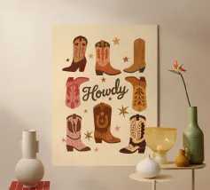 Un divertente disegno di ispirazione western con elementi da cowboy e da deserto. Gli stivali da cowboy, i cactus e la stella dello sceriffo creano una divertente atmosfera country. Questo motivo si concentra sulla cultura del rodeo e sull'estetica dei cowboy. Perfetto per gli appassionati dello stile Nashville, dell'arredamento western e della musica country.
