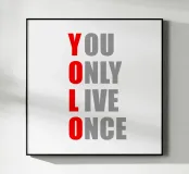 Questo potente lavoro tipografico incarna l'attivismo del design minimalista. L'intelligente acronimo Y-O-L-O viene trasformato in un messaggio visivo attraverso una precisa colorazione in rosso e grigio. Il carattere sans serif ricorda le tradizioni del Bauhaus e i manifesti di protesta contemporanei. Lo stile ridotto cita la tipografia politica di Barbara Kruger e la word art di Ed Ruscha. Un pezzo provocatorio che unisce gioia di vivere ed eleganza grafica, perfetto per ambienti moderni e luminosi.