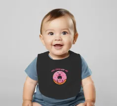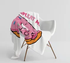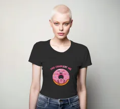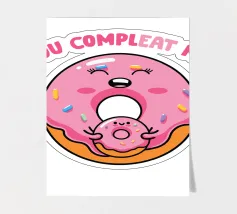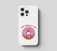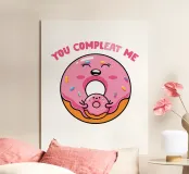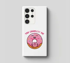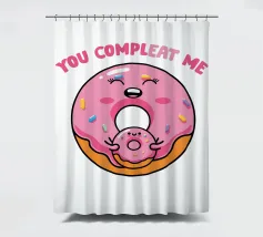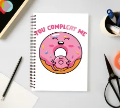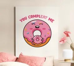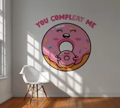 Una simpatica ciambella sorridente e una mini ciambella sono raffigurate in un design allegro, circondate da zuccherini colorati. Il testo rosa "Tu mi completi" è posizionato sopra.