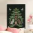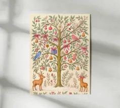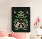 A festive folk art painting of woodland creatures under the branches of a Christmas tree.