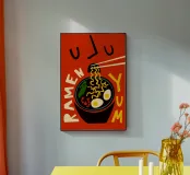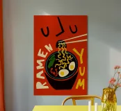 Questa vivace stampa ramen aggiunge un tocco giocoso e audace a qualsiasi spazio. Caratterizzato da un sorprendente sfondo rosso e da un divertente disegno astratto di una ciotola di ramen completa di noodles, uova e gamberetti, questo poster è perfetto per gli amanti del cibo e della cucina giapponese. I colori vivaci e l'eccentrica tipografia lo rendono un complemento ideale per cucine, sale da pranzo o ristoranti. Che siate appassionati di ramen o semplicemente alla ricerca di un'arte da parete unica, questa stampa apporta energia e creatività al vostro arredamento. Disponibile in varie dimensioni per adattarsi al vostro spazio.
