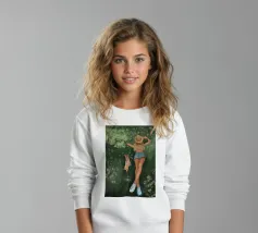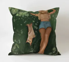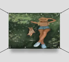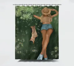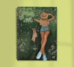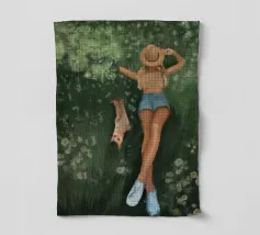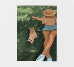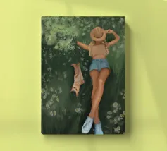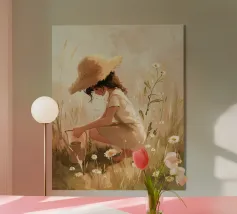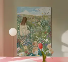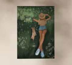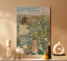 Bathed in dappled sunlight, a girl and her curious cat share a tender moment stretched across a bed of wildflowers. Her hand tips a sunhat over her eyes as if listening to the breeze, while her feline companion gazes up with gentle wonder. It's a portrait of unspoken connection, where the quiet rustle of daisies carries the heartbeat of a slow summer afternoon.