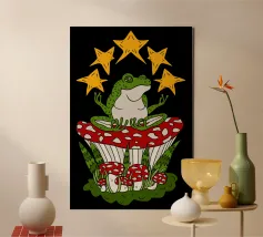 Rana zen seduta su un fungo rosso con stelle dorate. Ognuno ha la propria interpretazione di questo disegno, quindi lascio a voi la scelta. Ottimo regalo e decorazione per la parete del dormitorio o della camera da letto.