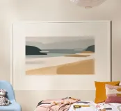 Piani semplificati di grigio tenue, bianco morbido e sabbia dorata raffigurano una costa riparata incorniciata da promontori scuri. La composizione minimalista bilancia terra e acqua in una scena costiera calma e moderna.