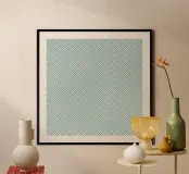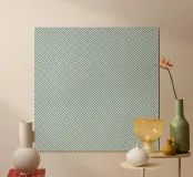Un motivo geometrico ripetuto crea un'intricata griglia di piccoli quadrati e triangoli nei toni del turchese e del bianco. Il disegno simmetrico conferisce all'immagine un senso di equilibrio e complessità.