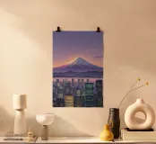 Questo dipinto iperrealistico presenta il Monte Fuji che si erge alto sotto il tenue bagliore delle luci della città di notte. Gli imponenti grattacieli di Tokyo brillano sullo sfondo della maestosa montagna, fondendo il realismo con un'atmosfera da sogno. La foschia atmosferica e gli strati di montagne lontane creano profondità e immersione, rendendo l'opera d'arte davvero realistica. La fusione di luci artificiali e tranquillità naturale racchiude il carattere unico del Giappone, dove modernità e tradizione coesistono armoniosamente.