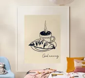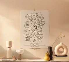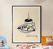 A charming black-and-white ink-style illustration featuring a steaming cup of espresso and a flaky croissant on a plate. The handwritten "Good morning" adds a warm and inviting touch, making this poster perfect for coffee lovers and cozy breakfast moments.