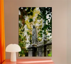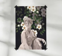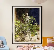 Una statua femminile tra rami di rose in una notte d'estate a Roma. Tecnica mista.