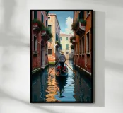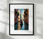 Un gondoliere, con una classica camicia a righe e un cappello di paglia, guida la sua gondola attraverso un tranquillo canale veneziano. Un piccolo ponte si inarca graziosamente sopra di lui, rendendo la scena ancora più pittoresca. Gli edifici in terracotta circostanti, con i loro delicati balconi fioriti, catturano il calore e l'autenticità di Venezia. L'acqua sottostante rispecchia l'architettura, creando un effetto surreale mentre la gondola scivola senza sforzo. Il gioco di luci e ombre accentua la texture dei muri invecchiati e i riflessi increspati del canale.