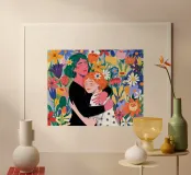 Due persone si abbracciano su uno sfondo di fiori vivaci e colorati. Gli elementi floreali dominano la scena, creando un senso di calore e affetto.