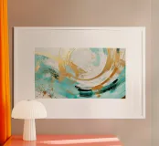 Arte moderna con forme color oro, forti contrasti e una texture in bianco e nero e turchese. Questo dipinto astratto in formato panoramico emana un'energia fresca e senza tempo. I colori si fondono in una composizione armoniosa.