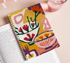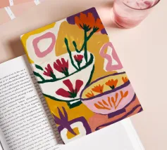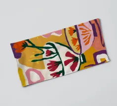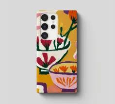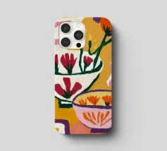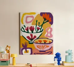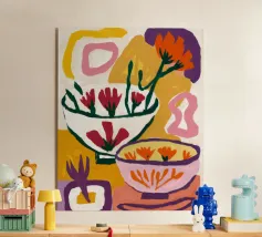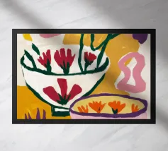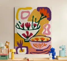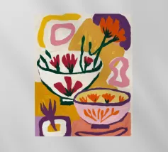 A bold and graphic abstract floral piece. Stylized flowers and leaves in a bowl are depicted with strong outlines and flat areas of color, creating a dynamic, modern, and highly decorative work of art.