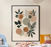 Questa stampa botanica minimalista presenta una disposizione armoniosa di foglie geometriche nei toni del verde, del marrone e del beige. L'opera d'arte è perfetta per aggiungere un tocco di eleganza ispirata alla natura a qualsiasi interno moderno.