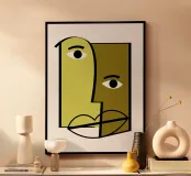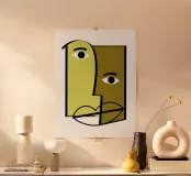 Due volti umani astratti si fondono utilizzando audaci forme geometriche e tonalità di verde e oliva. Lo stile minimalista enfatizza gli occhi e le labbra espressivi.