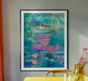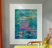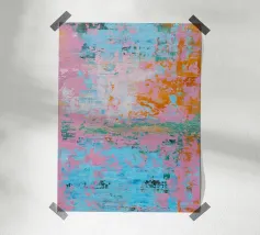 Le vibranti tonalità di rosa, blu e turchese si fondono in un vivace disegno astratto, creando un senso di movimento ed energia. I tratti audaci e i colori stratificati evocano un'atmosfera dinamica ed espressiva.