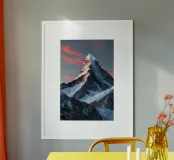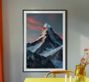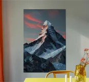 Questa drammatica opera d'arte reimmagina il K2 come una sinfonia astratta di cime frastagliate e audaci forme geometriche. Un caldo tramonto getta sfumature dorate sulle aspre strutture della montagna, enfatizzando le sue scogliere ghiacciate e gli spigoli vivi. Le forme triangolari e i vividi contrasti creano una composizione ipnotica che colma il divario tra realismo e astrazione. Un tributo straordinario allo spirito indomito della seconda vetta più alta della natura, quest'opera d'arte risuona tra gli scalatori e gli amanti dell'arte.