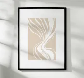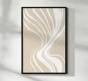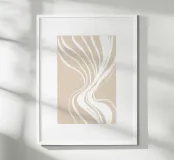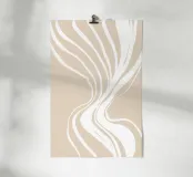 Opera d'arte minimalista caratterizzata da linee bianche fluide e vorticose su uno sfondo beige caldo. Ideale per spazi contemporanei e sereni.