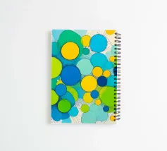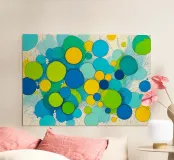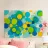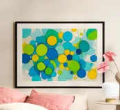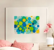 Quest'opera astratta presenta una vivace composizione di numerosi cerchi di diverse dimensioni. La tavolozza dei colori è dominata da un giallo brillante, un blu intenso e un fresco verde lime, completati da toni più chiari di turchese e ciano. I cerchi si sovrappongono parzialmente, creando una certa profondità e trasparenza. Lo sfondo è luminoso e infuso di spruzzi di colore dinamici e linee sottili e veloci che aggiungono una texture vivace ed energica. L'immagine emana un'allegria giocosa e moderna.