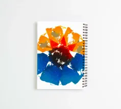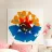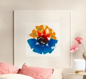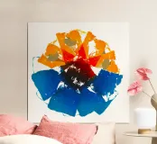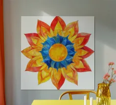 Quest'opera digitale o espressionista astratta presenta una composizione centralizzata a forma di fiore o di sole. È dominata da una tavolozza di arancioni e rossi brillanti nella parte superiore e di blu intensi in quella inferiore, che si incontrano in un centro scuro, quasi nero. Lo stile è caratterizzato dalla frammentazione, con una texture che ricorda i mosaici spezzati o le pennellate grezze. I bordi duri e la disposizione esplosiva creano una forte dinamica ed energia sullo sfondo bianco puro. L'immagine è intensa e fortemente astratta.