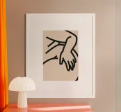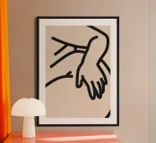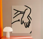 Caratterizzata dalla suggestiva composizione di una mano appoggiata su una forma curva, quest'opera d'arte trasmette l'intimità e l'eleganza del legame umano. Lo sfondo beige neutro completa i tratti neri decisi, rendendola un'aggiunta versatile e sofisticata al vostro arredamento contemporaneo, un pezzo sottile per interni moderni.