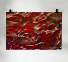 Opera d'arte astratta con molta energia ed emozione, colori forti e brillanti (rosso, giallo, nero), forme e linee emozionanti. Fuoco e acqua.