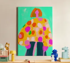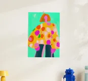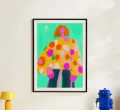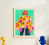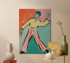 Una figura vibrante e ritagliata della Pop Art massimalista che mostra una moda audace e un colore espressivo. Il soggetto indossa un maglione giallo a collo alto e oversize, ricoperto da grandi pois astratti con spesse pennellate espressioniste di rosa caldo, arancione, bianco e verde smeraldo. Questo energico disegno è nettamente contrastato da pantaloni di un profondo blu navy e da uno sfondo dominato da una texture di un brillante verde acqua/teal, creando uno scontro cromatico scioccante ma gioioso. La texture tattile della vernice dà l'illusione di un dipinto a olio spontaneo. Il pezzo incarna perfettamente il Decoro Dopamina e la gioiosa maxi