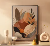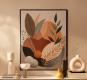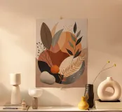 Un'accattivante opera d'arte astratta ispirata alle vibranti tonalità e alle forme organiche dell'autunno. L'opera presenta un'armoniosa miscela di toni terrosi, elementi strutturati e delicati motivi botanici, creando un'atmosfera serena e invitante.