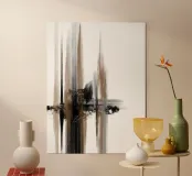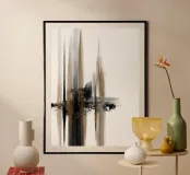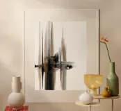 Stampa d'arte astratta su carta premium, incorniciata in legno naturale, ideale per decorare soggiorni e uffici dal design moderno. Questo quadro senza possibilità di personalizzazione offre un tocco sofisticato e contemporaneo agli ambienti, prodotto secondo standard europei di alta qualità.