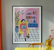 Una donna in pigiama a righe legge in una stanza vivace con pareti rosa e arredamento eclettico.