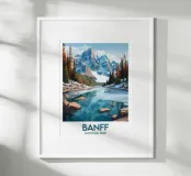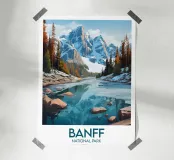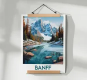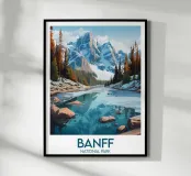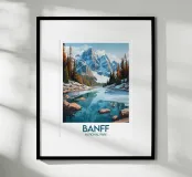 Questo poster raffigura il Parco Nazionale di Banff con le sue cime innevate, il lago cristallino e le foreste colorate. Un'illustrazione ideale per gli amanti dei paesaggi maestosi e della natura selvaggia per la vostra decorazione murale.