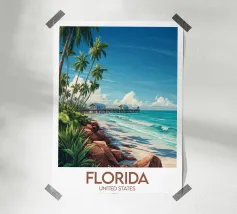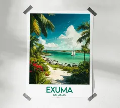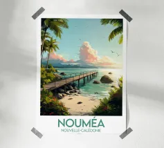 Un'illustrazione paradisiaca di un pontile di legno su una spiaggia del Belize, circondato da palme e da un mare turchese. Un poster di viaggio rilassante, ideale per creare un'atmosfera esotica e naturale nella vostra casa.