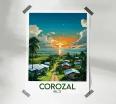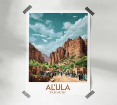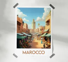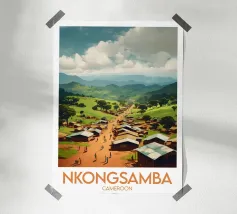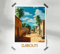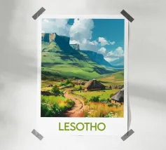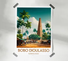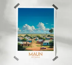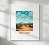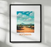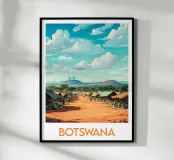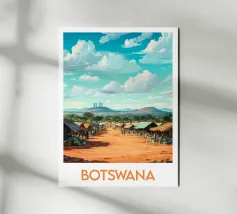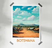 Cette affiche du Botswana met en valeur un marché traditionnel animé au cœur d’un paysage africain aux couleurs chaudes. Avec ses étals bordant une large piste ocre et son ciel spectaculaire, elle évoque la vie locale authentique et la richesse culturelle du pays.