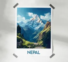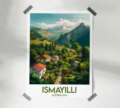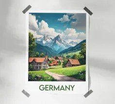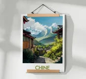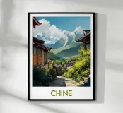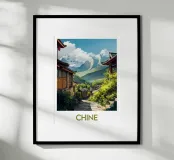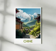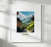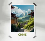Un affascinante villaggio tradizionale cinese si trova ai piedi di montagne innevate, circondato da una natura rigogliosa e da un'architettura antica. Un'illustrazione pacifica, ideale per una decorazione murale al tempo stesso culturale e naturale.