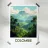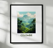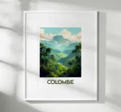 Questa lussureggiante illustrazione raffigura un paesaggio colombiano dove la giungla tropicale incontra le vette andine. Un fiume serpeggia tra le colline, costeggiato da palme e vegetazione abbondante. Un poster ideale per un'ambientazione esotica e naturale.