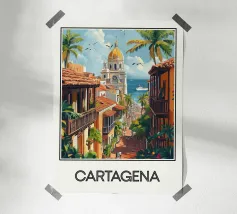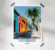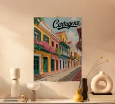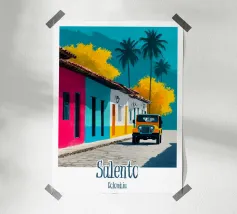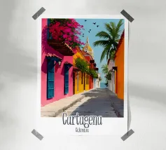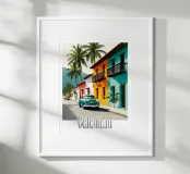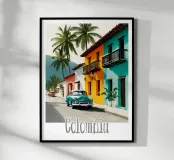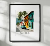 Una strada colombiana fiancheggiata da case colorate e palme, con un'auto retrò che richiama la calda atmosfera di altri tempi. Un poster dal fascino tropicale e nostalgico.