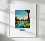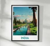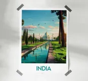 Poster artistico del Taj Mahal circondato dal verde, sotto un cielo pastello. Un simbolo senza tempo dell'India da esporre in casa per un tocco di evasione e poesia.