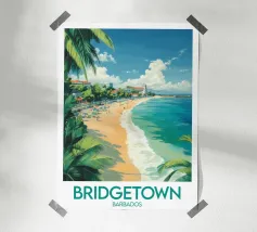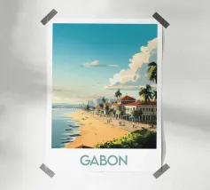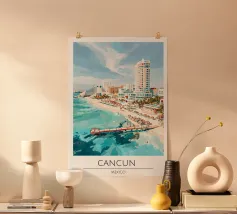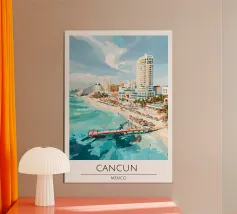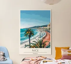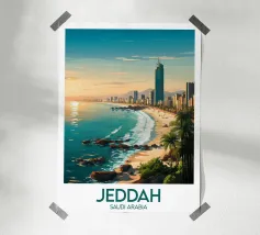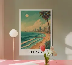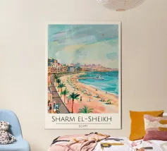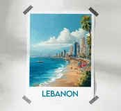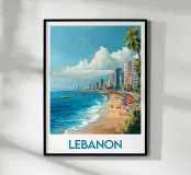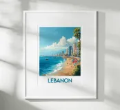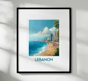Poster di viaggio che raffigura il vivace lungomare di Beirut, con i suoi moderni grattacieli, la spiaggia assolata e gli ombrelloni colorati che si affacciano sul Mediterraneo. Un'illustrazione ideale per gli appassionati di città costiere, cultura orientale e paesaggi marini. Perfetta per una decorazione murale estiva e urbana.