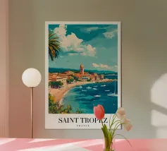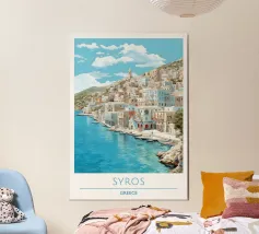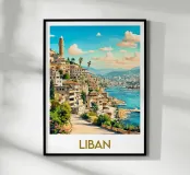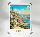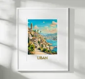Poster di viaggio che illustra un tipico villaggio libanese a terrazze, con le sue case chiare che si affacciano su un porto mediterraneo e sulle colline sullo sfondo. Un'illustrazione ideale per gli amanti del fascino levantino, dell'architettura tradizionale e delle viste soleggiate sul mare.
