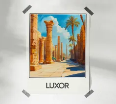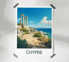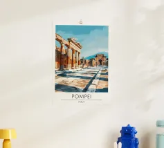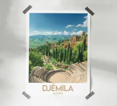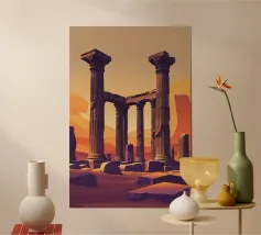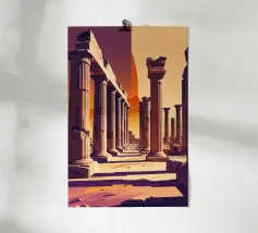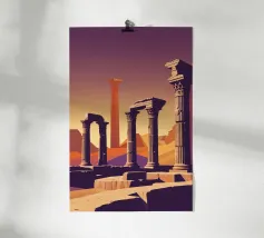 Poster di viaggio che illustra le antiche rovine di Leptis Magna in Libia, con le sue colonne romane e i maestosi archi sotto un cielo limpido. Un'illustrazione da parete ideale per gli appassionati di storia, archeologia e civiltà mediterranee. Perfetta per decorare con un tocco di antica grandezza.