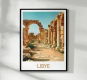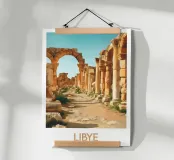 Poster di viaggio che raffigura le maestose rovine romane di Leptis Magna in Libia, con le sue antiche colonne e gli archi scolpiti immersi in una luce dorata. Un'illustrazione perfetta per gli appassionati di storia antica, civiltà mediterranee e siti archeologici unici.