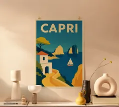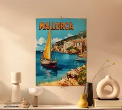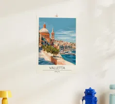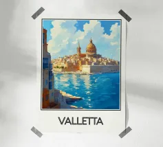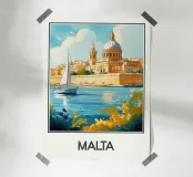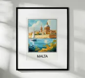 Scoprite il fascino mediterraneo di Malta con questa illustrazione che immortala La Valletta, la sua splendida architettura barocca e il suo vivace porto. Una barca a vela scivola su acque cristalline sotto un cielo azzurro, creando una scena elegante e solare, perfetta per una decorazione raffinata ed esotica.