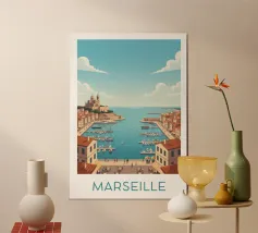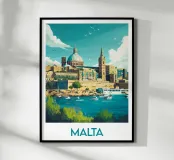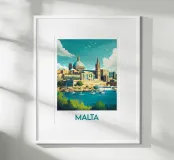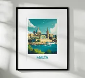 Affiche Malte illustrant les couleurs ensoleillées de La Valette, entre mer turquoise et architecture historique. Parfaite pour une décoration murale qui invite au voyage et à l’évasion méditerranéenne.