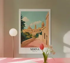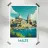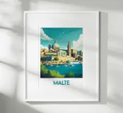 Poster per Malta con il porto e i monumenti iconici di La Valletta sotto un cielo brillante. Un'illustrazione perfetta per arricchire una decorazione murale con uno spirito di viaggio e di mare.