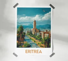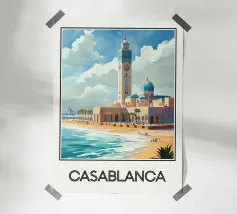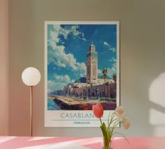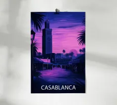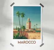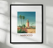 Affiche Maroc illustrant la célèbre Koutoubia de Marrakech entourée de palmiers et de remparts. Une illustration parfaite pour une décoration murale inspirée de l’architecture et de l’atmosphère marocaine.