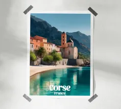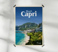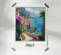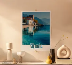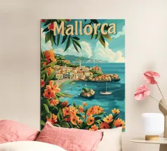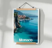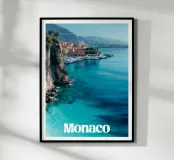 Poster artistico di Monaco che raffigura la costa mediterranea con le sue scogliere, le palme e il porto pieno di yacht di lusso. Una decorazione murale elegante e raffinata che cattura il fascino della Riviera, ideale per valorizzare un interno moderno e per viaggiare dal vostro salotto.